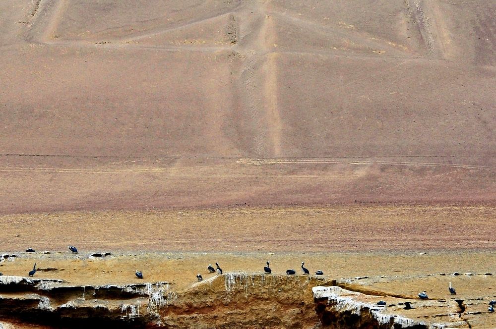 Located on a barren hillside near the Ballestas Islands, off the coast of Paracas, the geoglyph of the Paracas chandelier has intrigued visitors for centuries. This enigmatic design, measuring around 180 metres in height, is carved into the sand and visible from the sea. Its shape is reminiscent of a candelabra or a trident, but its meaning remains mysterious. Some believe it was a navigational symbol for ancient sailors, while others associate it with rites or religious symbols of the Paracas culture. This geoglyph has stood the test of time thanks to the absence of rain in this desert region. In the foreground of the image, you can see the steep rock formations of the Ballestas Islands, covered in guano, where many seabirds congregate. This site is a veritable natural and cultural sanctuary, where ancient art blends with ecological wealth.