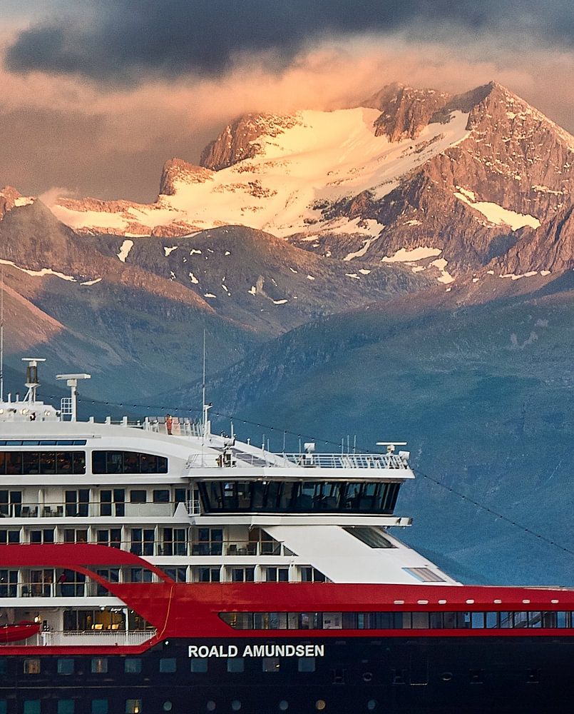 MS Roald Amundsen is a new hybrid powered Hurtigruten expedition cruise ship. She was built by Kleven Yards of Norway and began her maiden voyage from the Norwegian port of Tromsø to Hamburg on July 3, 2019. She and her sister ship Fridtjof Nansen are the first hybrid-powered ships in the Hurtigruten fleet.