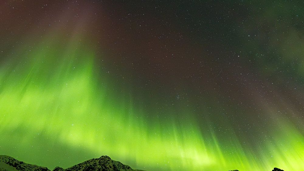 The lines of the northern lights beautifully follow the shape of the mountains present around this fjord. High above the green, the colour changes to red light.