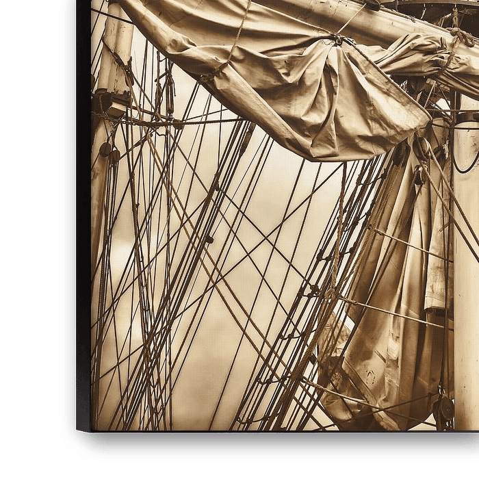 Sepia image of an old sailing ship with weathered sails