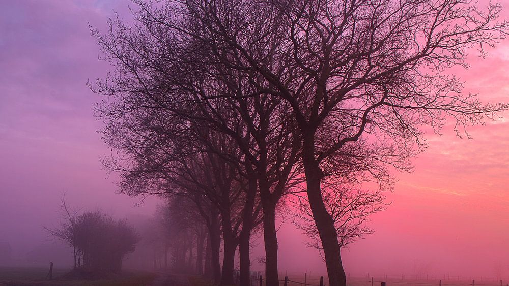 View of a road with a ditch next to it and to the right, the trees the exuberant colours of the sunset, with a bit of fog above the meadow.