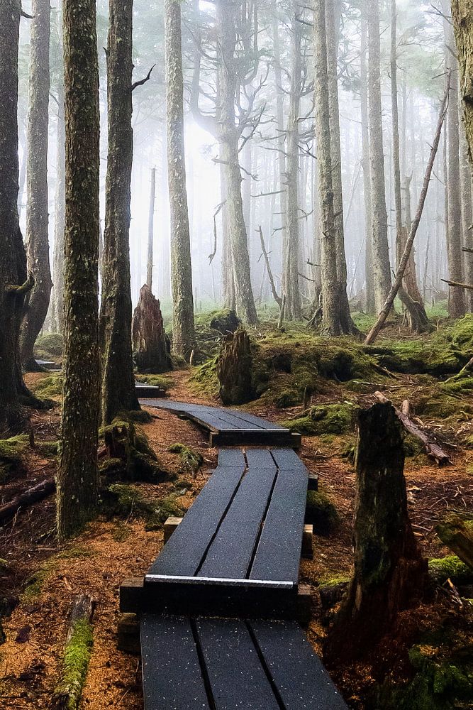 The islands of Haida Gwaii along Canada's central west coast are known for their bad weather, thick fog and giant trees. The tops of the trees soon stick out in the clouds and fog giving you a beautiful and mysterious landscape. This path went straight through the forest.