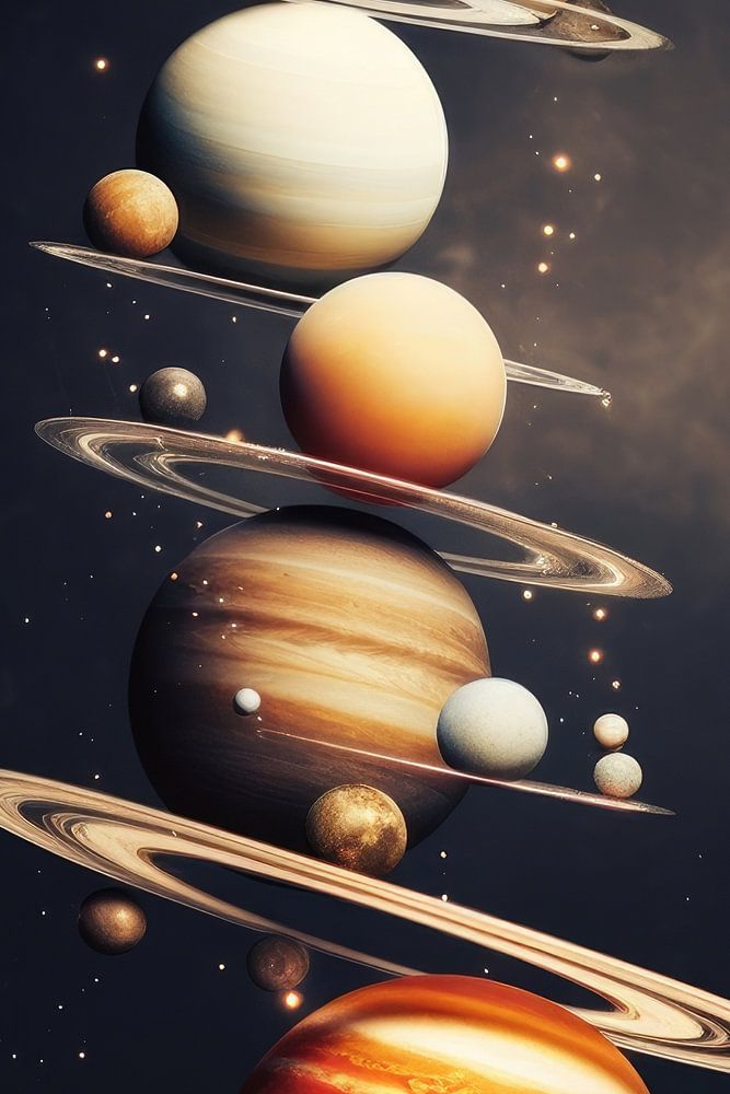 Bring the wonders of the universe straight to your home with our beautiful painting: "Planets on top of each other like art in the galaxy." Instead of the usual deep blue hues, we have created this artwork with vibrant colours that let the planets shine. The combination of rich earthy tones and bright accents brings a sense of warmth and mystery to your space. This unique artwork is not only visually impressive, but it also stirs the imagination and makes you dream away about distant worlds. Whether you are an astronomy enthusiast or just looking for a beautiful piece to brighten up your walls, this painting is a must-have for any space lover.