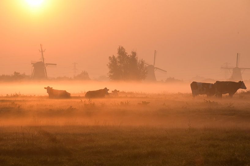 Sunrise in the still foggy polder.