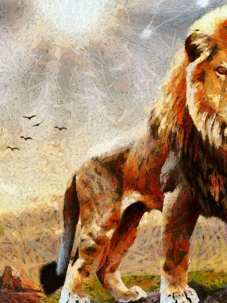 The depiction of the lion on a rock, gazing proudly…