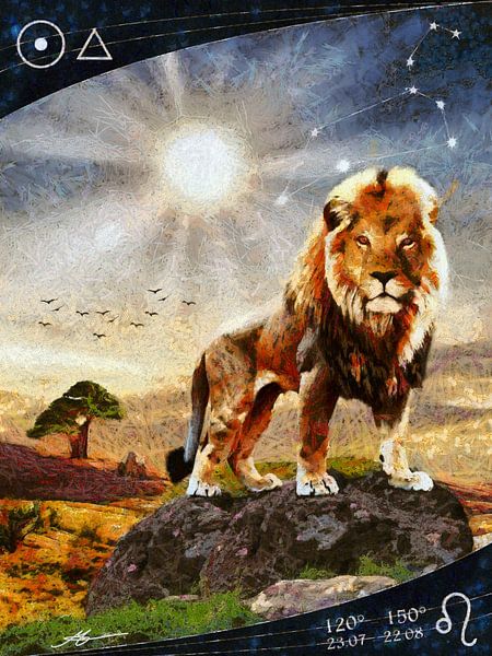 This artwork is a powerful depiction of Leo, the zodiac sign that symbolises bravery, self-confidence and natural leadership. The majestic lion in the picture symbolises not only strength and courage, but also the fiery temperament associated with the astrological sign of Leo.