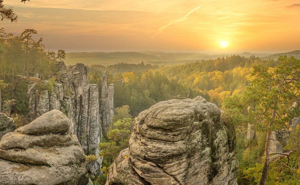 The prehistoric skyscrapers of Český ráj, sunset in beautiful landscape in the Czech Republic