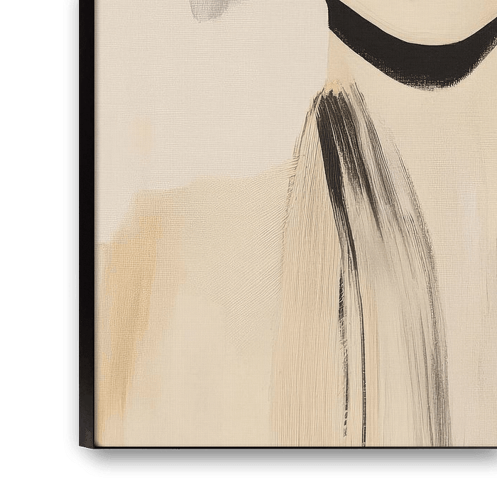 This work exudes elegance and minimalism. The woman has a porcelain complexion and her facial features are subtle, almost perfectly balanced. With her eyes closed, she exudes serenity and inner peace. Her long, dark hair falls down smoothly, and a striking flower in soft shades of purple adorns her head. The interplay of clean lines and flowing brushstrokes creates a sense of calm and sophistication, as if she is in a world of introspection.