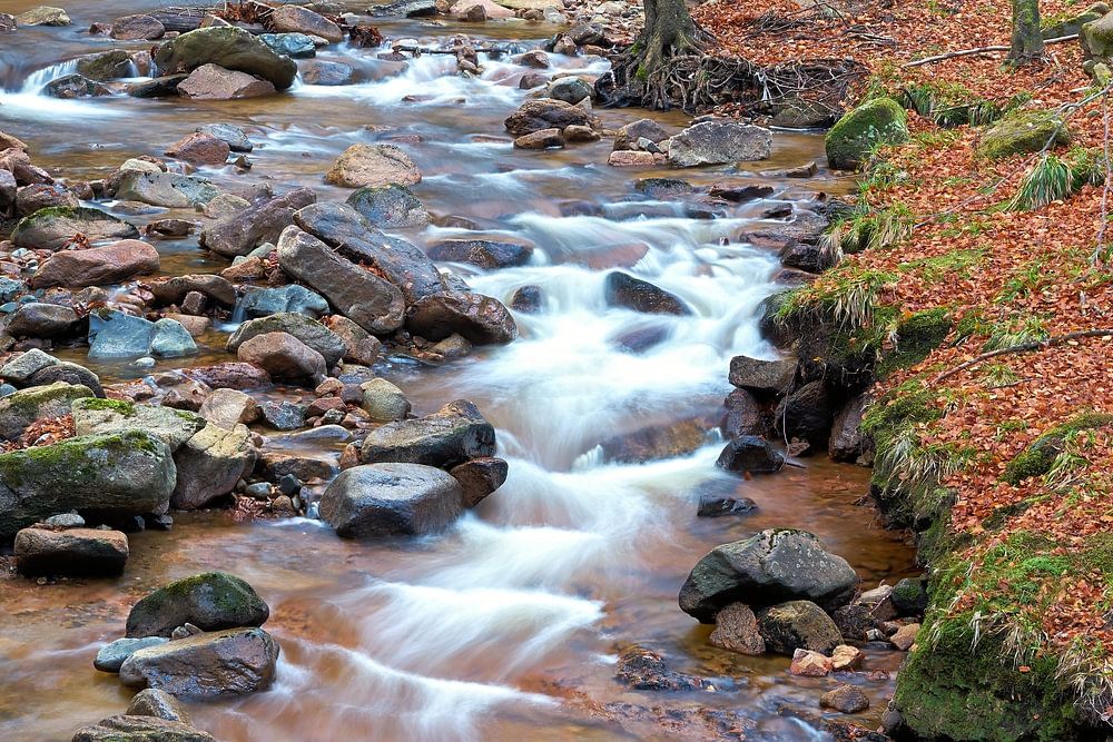 The river Ilse in the romantic Ilse valley at a hiking trail at the foot of the Brocken in the Harz National Park in Germany. The Ilse valley near Ilsenburg is very popular with hikers as a starting point for a hike to the summit of the Brocken.
