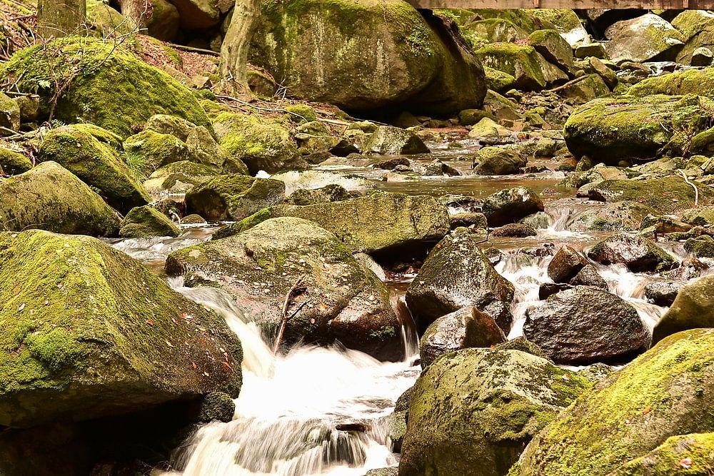 The river Ilse in the romantic Ilse valley at a hiking trail at the foot of the Brocken in the Harz National Park in Germany. The Ilse valley near Ilsenburg is very popular with hikers as a starting point for a hike to the summit of the Brocken.