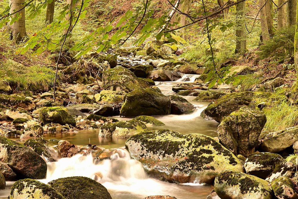 The river Ilse in the romantic Ilse valley at a hiking trail at the foot of the Brocken in the Harz National Park in Germany. The Ilse valley near Ilsenburg is very popular with hikers as a starting point for a hike to the summit of the Brocken.