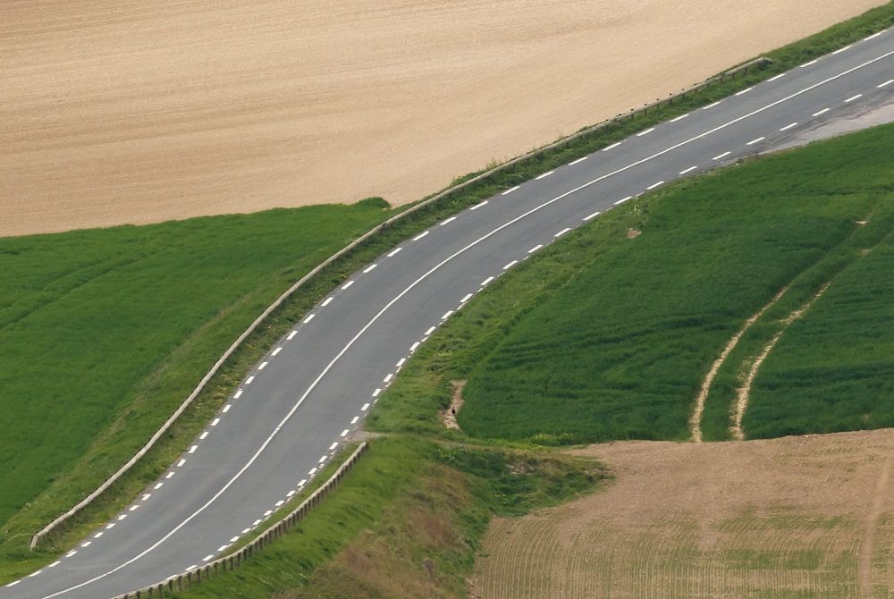 The road that runs between the various fields and meadows in the hills of the Opal Coast