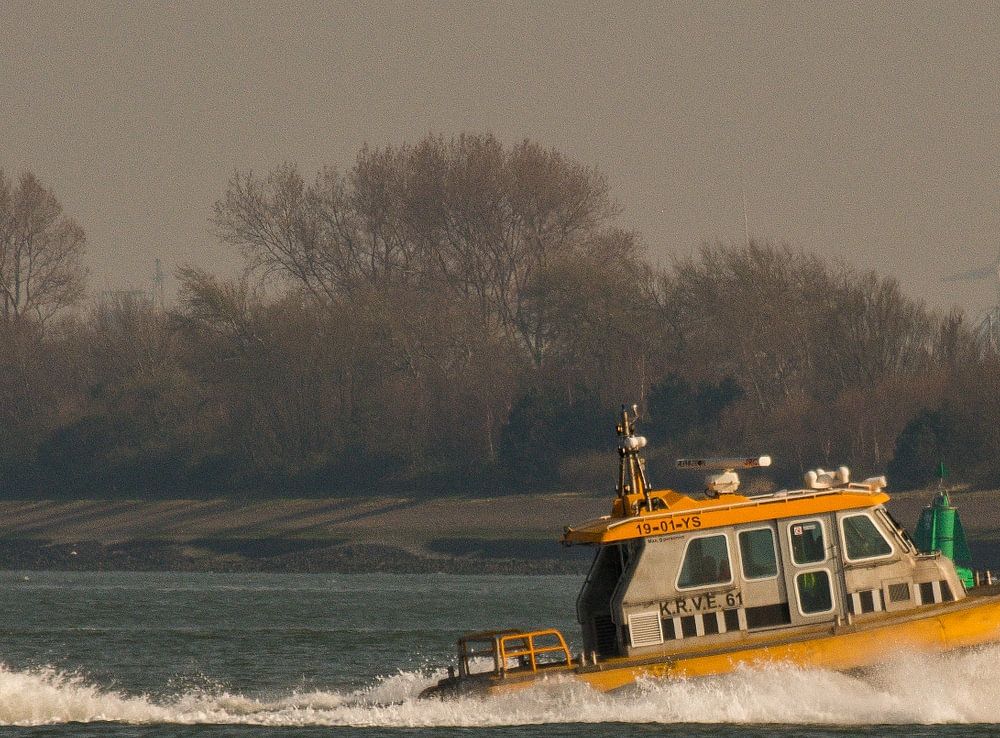 Always underway always almost always big bow waves and a churning trail of propeller water. The rowers here on the Nieuwe Waterweg on a late evening in the sunset. The Rozenburg peninsula in the background and the golden light of the setting sun. The action frozen in the photo.