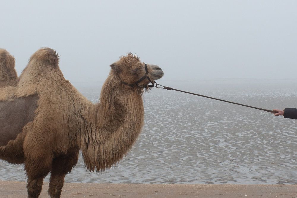 On a foggy winter day at the beach, a camel suddenly came along. So glad I had my camera with me! :)