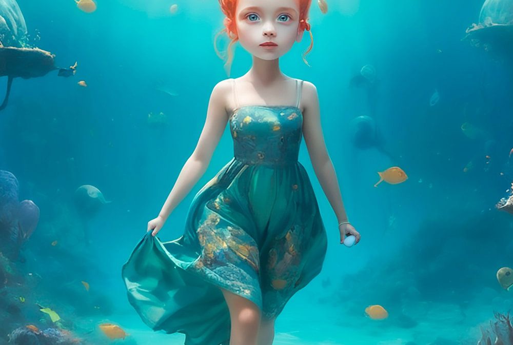 A sweet little sea girl, she lives at the bottom of the sea, among the beautiful colourful coral and colourful fish. She lives like a mermaid, the seabed is her home. She wears her bright orange hair in two buns and her dress sways with the waves. The image was generated using ai.