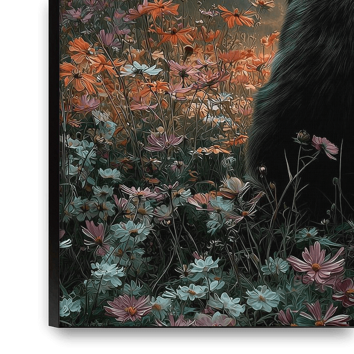 An image of rare tranquillity and gentle magic. A majestic black cat sits deep in a field of delicate, bright wildflowers and looks back over its shoulder into the glistening light of the full moon.