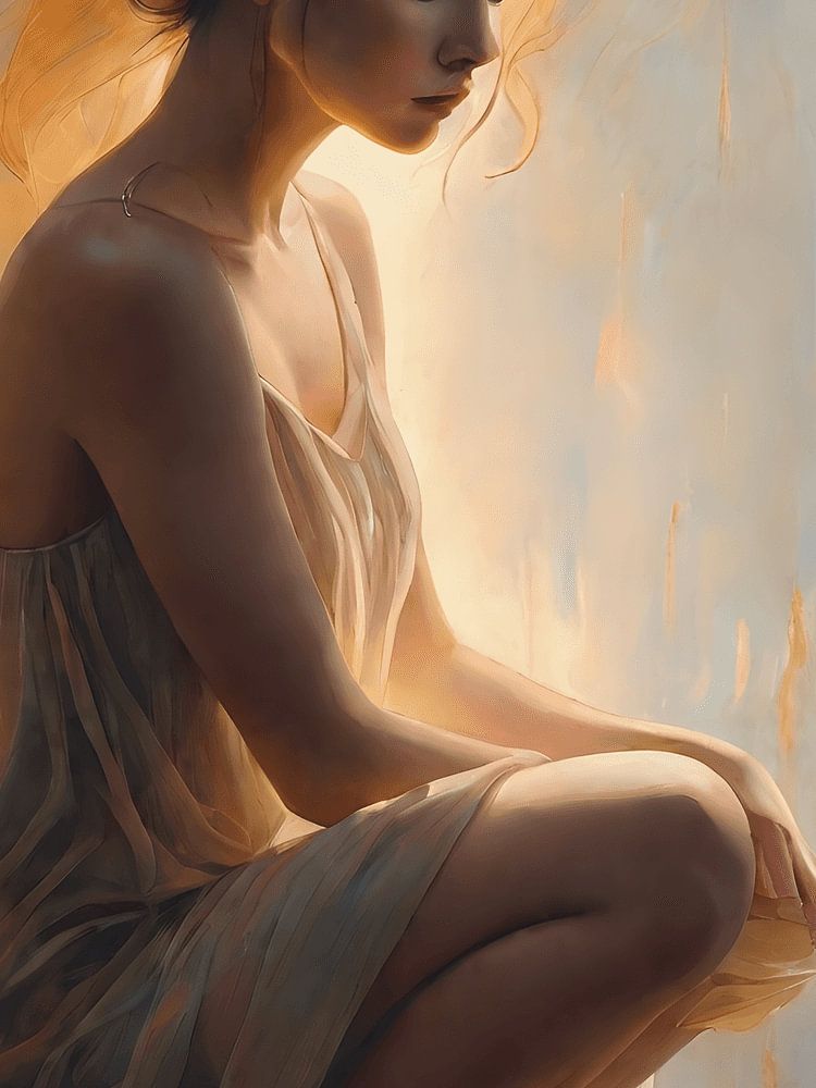 At first glance, you see a young woman, crouched vulnerably, eyes closed - a moment of silence, of fatigue perhaps. But look closer: her shadow is not a reflection of weakness, but of a lion. Majestic, strong, unyielding. A primal force slumbering deep inside.