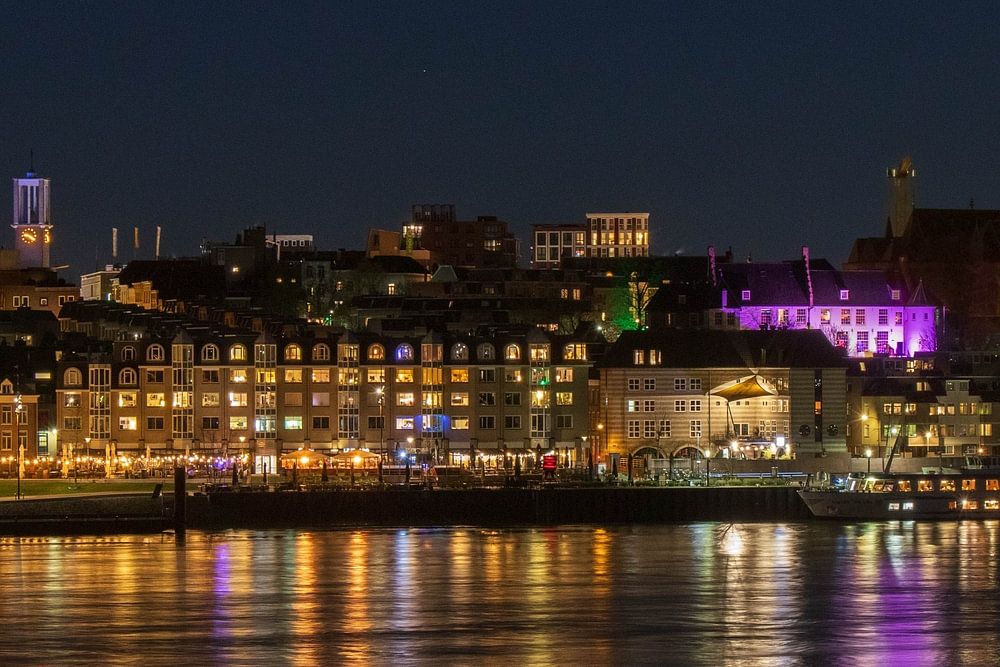 This photo captures a nighttime view of the historic city of Nijmegen, taken from across the Waal River. The city is illuminated by warm, shimmering lights that reflect on the calm surface of the river, creating an atmospheric and magical effect. The Sint-Stevenskerk, the city's landmark, stands prominently in the background, adding a touch of history and grandeur. The light accents in various colors, such as purple and green, give the scene a modern twist and vibrancy. The dark sky accentuates the glow of the city lights and creates an impressive contrast with the water surface and architecture.