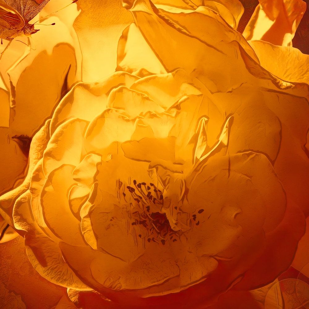 The small world of roses may not be so small. Roses occupy a big place in the world of flowers. It is naturally considered the flower of love for us humans and that not only on a special day like Valentine's Day, but all year round. So it is an important flower. So important that it is a world unto itself. That is what happened here. The rose became the earth and floats around in the universe. It gives off such a beautiful glow, a really beautiful light that illuminates even our big world. It is visited by a butterfly, glowing in that beautiful light, really wanting to see how special it is. And special it is. We humans have made it so special, especially for the only person in our lives worthy of such'a beautiful flower. The colours in this surreal artwork are mainly orange, but yellow and brown are also used here.