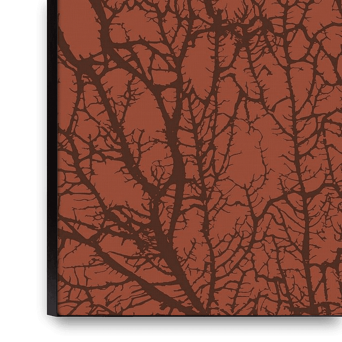 A depiction of a forest with trees and branches in abstract dark brown lines on a background in warm terracotta in Scandinavian style.