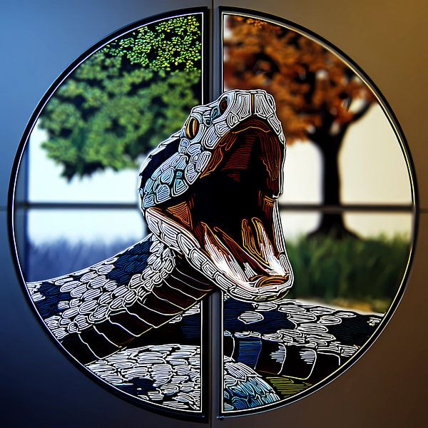A snake rises in the centre of a perfect circle, its mouth open in a frozen moment of warning and awakening. Divided by a vertical axis, the world behind it changes from renewal to decay - green life on one side, autumnal surrender on the other. The snake becomes a living threshold, embodying balance, danger and transformation. Designed…