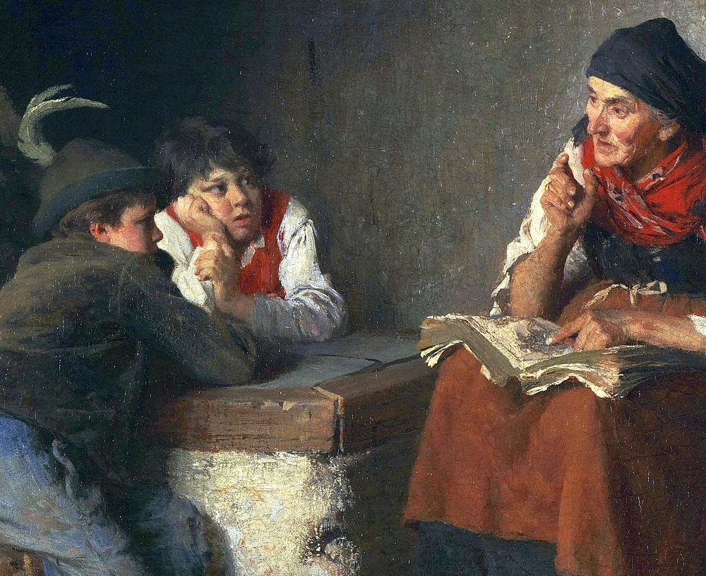 This old woman tells a fairy tale to three children who listen intently to the story full of fantasy.