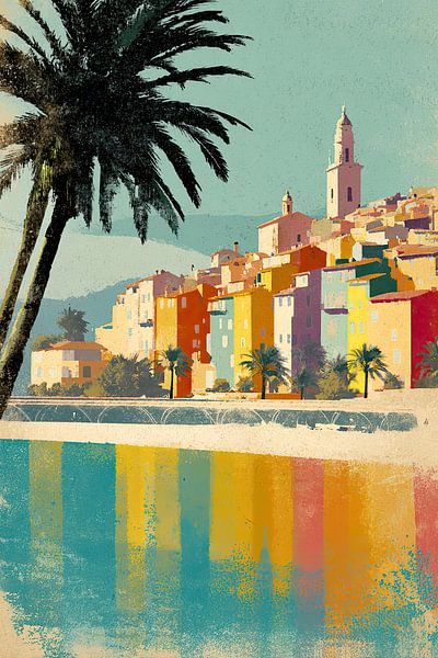 This artwork depicts a colourful southern European coastal town in an illustrative style with a tactile texture. The vertical composition is framed on the left by two palm trees, whose dark silhouettes contrast with the rest of the scene. The buildings on the hill consist of a stack of façades in varied shades of yellow, orange, pink,…