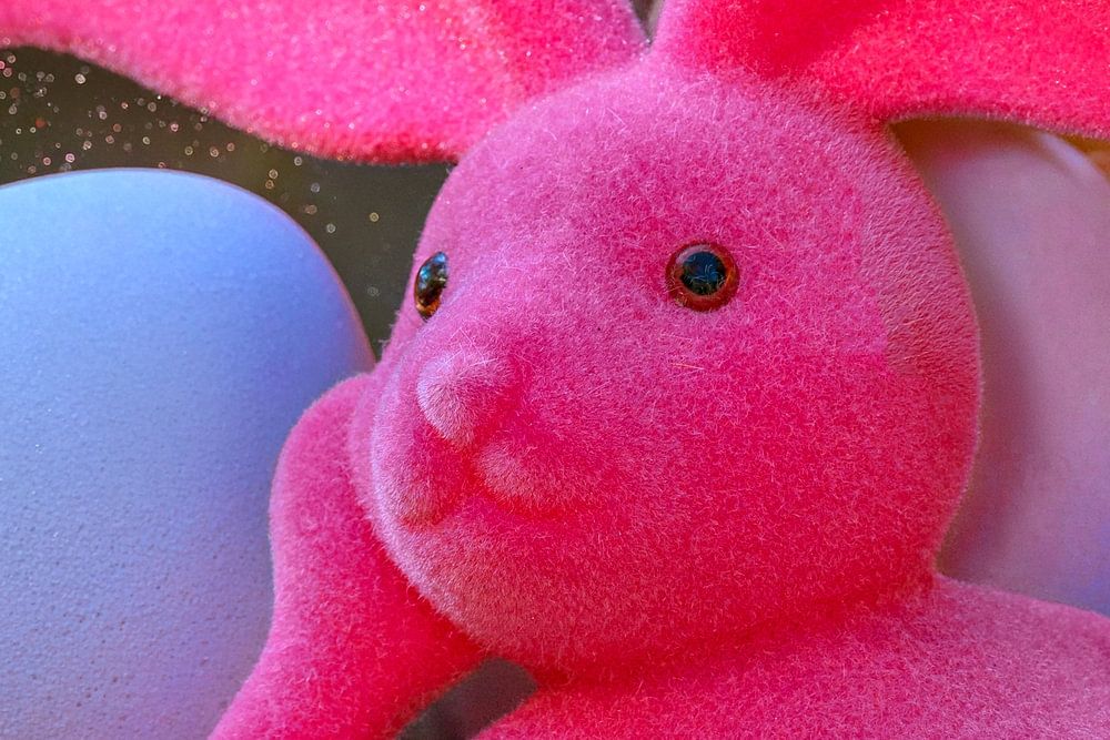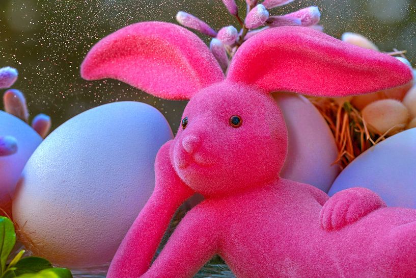 Nestled amongst gently shimmering eggs, the utterly relaxed Easter Bunny savours a moment of peace, whilst his bright pink fur provides a modern contrast to the classic spring décor. Delicate sprigs of blossom reach into the background and fine glitter dust dances through the air like magical icing sugar, lending the scene an almost…