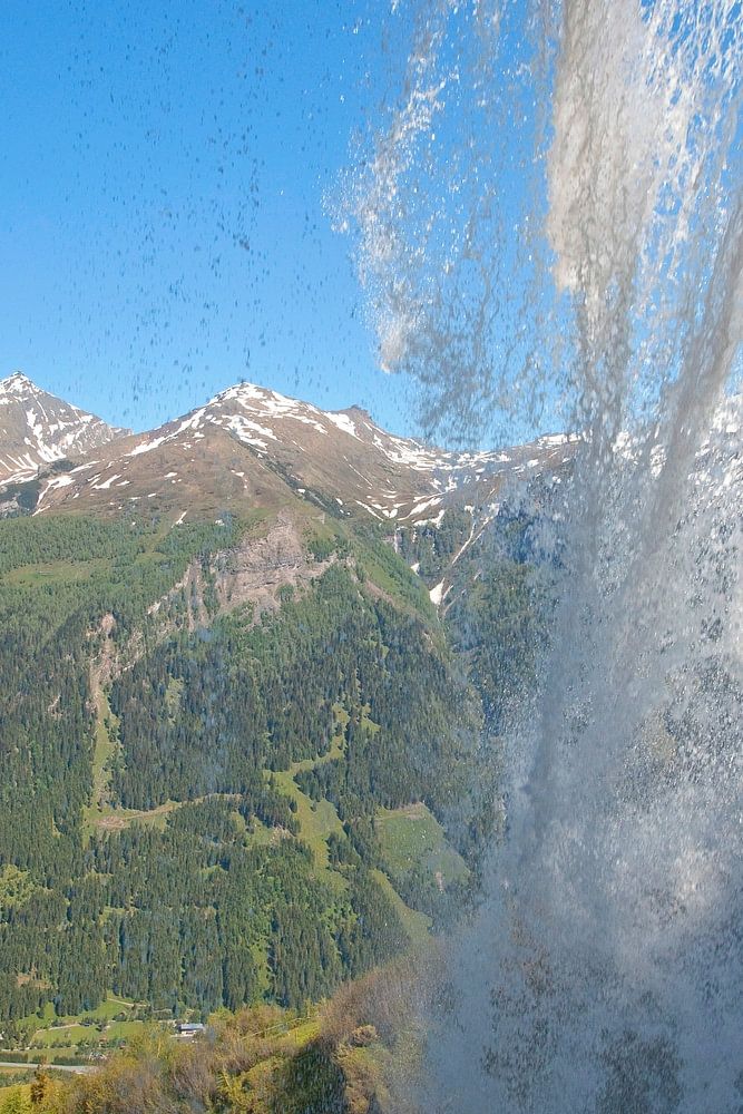 The Schleierfall with rainbow in Ferleiten and the view of the Glockner group