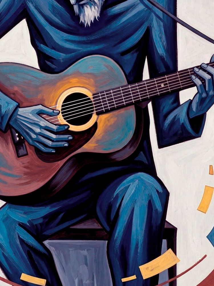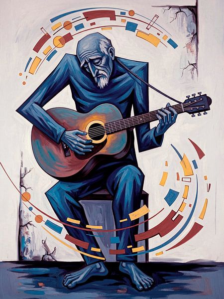 Anyone with a bit more knowledge of art will recognise the source of inspiration: Picasso’s old guitarist, a homeless, blind old man who sits hunched over his guitar, playing on the streets of Barcelona, looking more dead than alive. A work from a sad, depressive…