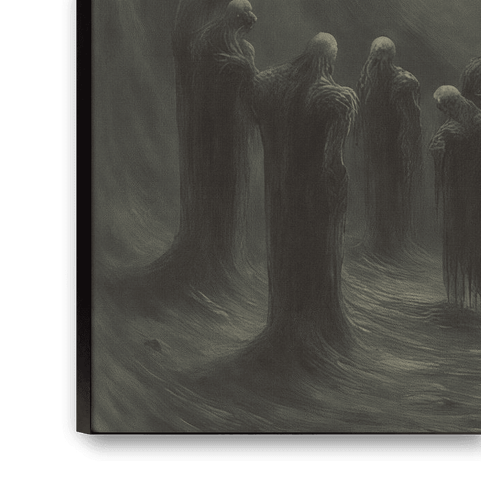Andreas Manfred Gebhards "Das Opfer" ist ein packendes, tiefgründiges Kunstwerk, das durch seine düstere Atmosphäre und seine suggestiven Bilder fesselt. Das Bild ist in einem monochromatischen Farbschema mit einem dominierenden Grauton gehalten, das nur durch den schwach leuchtenden gelben Kreis im Hintergrund durchbrochen wird. Die Szene zeigt eine Gruppe von Gestalten, deren Körper in einem fließenden, fast schmelzenden Zustand dargestellt sind, was ihnen ein geisterhaftes, unirdisches Aussehen verleiht.