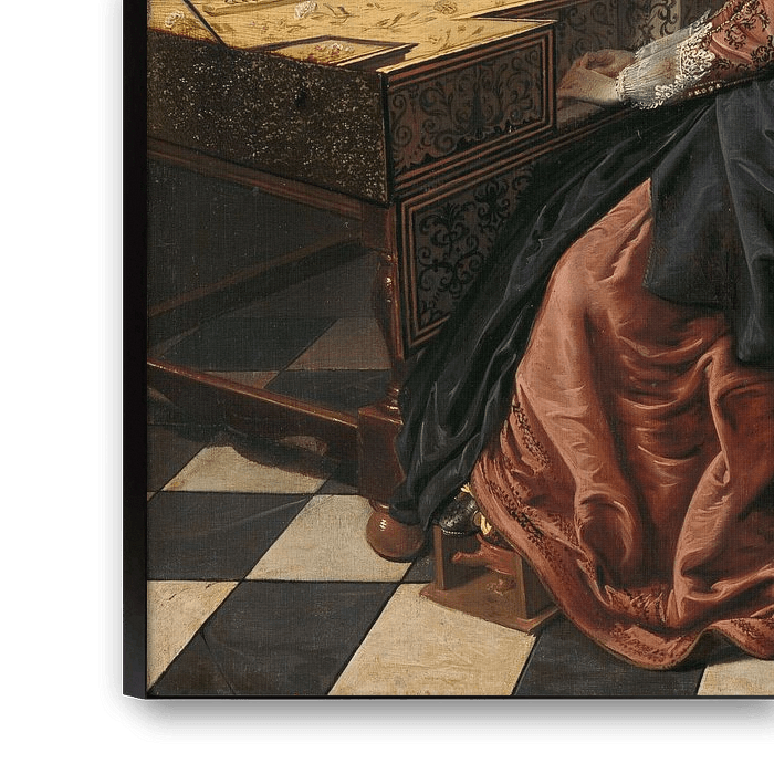 A young woman, in a distinguished interior, plays on the virginal. On the lid of the instrument is a landscape painted with an intimate walking couple. Music brings people together - invites the musician to play with it? There happens to be a young man coming into the room. On the instrument is a monkey as a warning against the dangers of pure carnal lust.