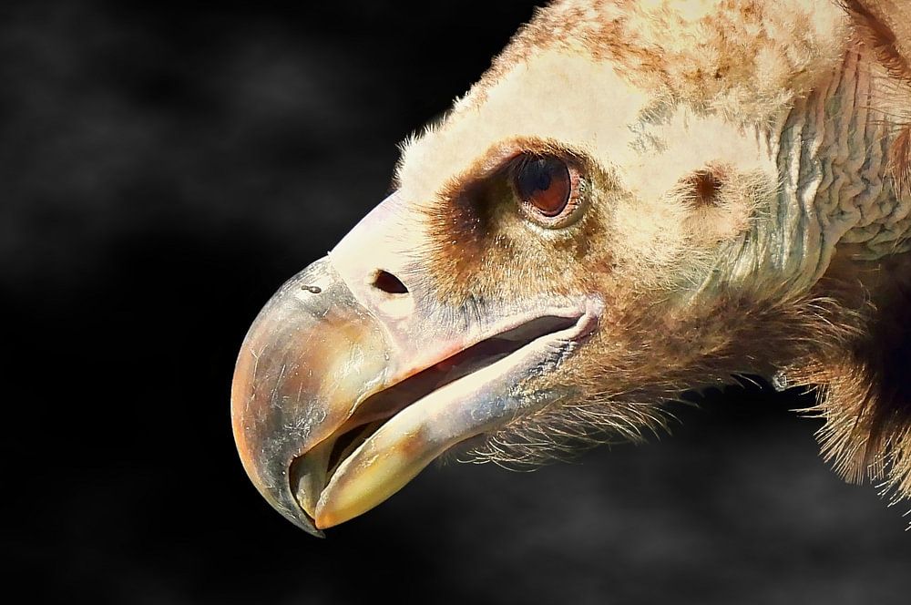 The vulture with its menacing gaze, expertly crafted on a dark background that makes the animal appear to hover in full flight.