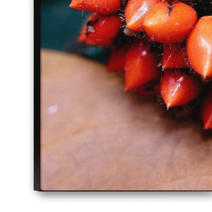 This photograph shows a dense cluster of reddish-orange fruit that has fallen to the ground in the Botanical Gardens of Bogor, Indonesia. The small, smooth, shiny fruits are piled up in a compact formation that immediately catches the eye with the intensity of their flamboyant hues. Their elongated, slightly pointed shape, accentuated by a few fine asperities, testifies to the exoticism of this tropical species, probably derived from a palm tree or related plant. The visual contrast is reinforced by the natural background, with its mix of green and brown leaves, reminiscent of the richness of the forest litter. This scene evokes both the abundance and the life cycle of tropical plants, where fruiting becomes a source of food for the local fauna while contributing to the regeneration of the forest. The cluster seems to embody the opulence and vitality characteristic of equatorial environments. As well as its aesthetic appeal, this image is an invitation to contemplate the abundant biodiversity for which the Bogor Botanical Garden is renowned, a veritable living conservatory of Indonesia's plant riches.