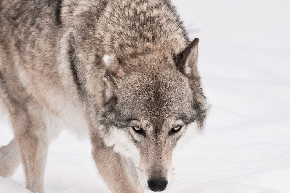 The wolf walks with his head down. The wolf walks through the snow in winter, a powerful and dangerous wild beast.