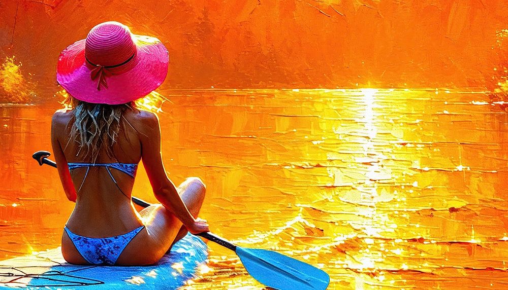 In this atmospherically dense work, a scene of quiet poetry and sensual intensity unfolds - a picture that seems like a painting, imbued with the magic of a rural evening under the spell of the setting sun. On a quiet forest lake, framed by delicate birch groves on either side, a woman with a paddle floats on a blue paddleboard. She sits motionless, almost meditative, her gaze directed towards the glowing red sun, which is still high on the horizon and pours across the sky in a dramatic play of colours of red, orange and saffron.