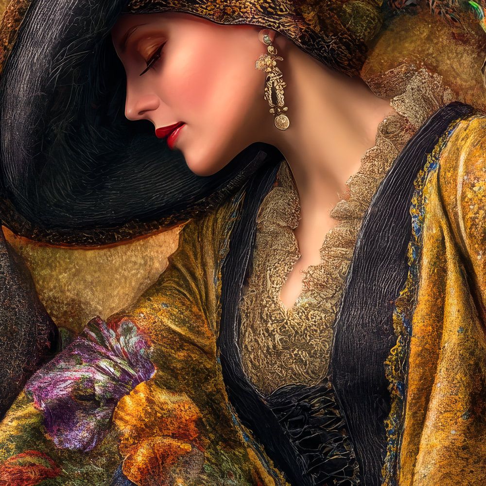 This work shows an elegant woman dressed in a 1920s luxury robe, rendered in warm bronze and gold tones that exude a sense of wealth and sophistication.