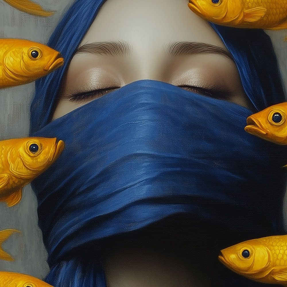 A closed-eyed woman wears a blue cloth covering her face, while surrounded by bright yellow fish that seem to float in a misty, grey background. The mood of the artwork evokes a sense of mystery and dreaminess, with the contrasts between the vibrant colours of the fish and the cool, muted tones of the background creating an almost hypnotic effect. The surreal painting style enhances the magical and unreal atmosphere, making it seem as if the woman is in a dream world, disconnected from reality.