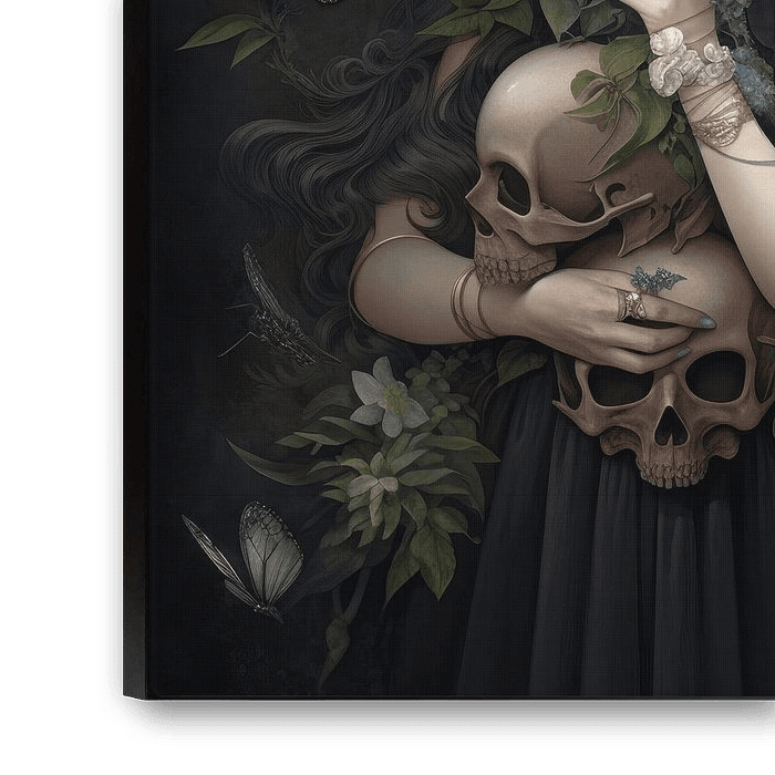 A portrait of a young woman buried in a bouquet of leaves, flowers and fluttering butterflies. The woman reflects and hides behind a skull mask and carries two skulls.