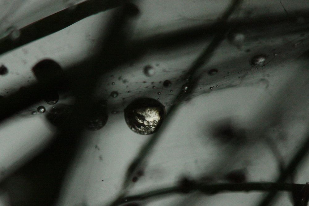 Regendruppels hangend aan een spinneweb in het gras. In de druppel in het midden, kun je de omgeving onderste boven zien