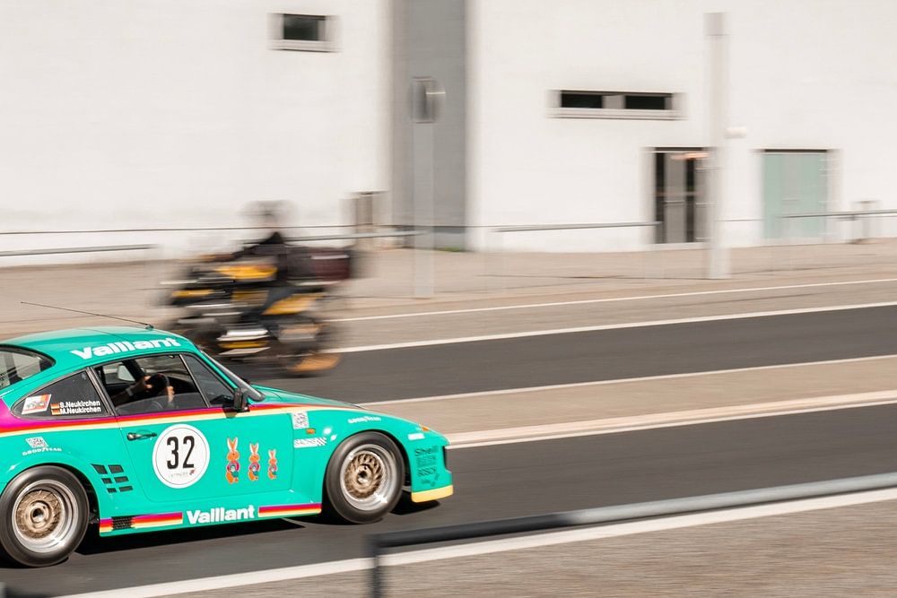 Rolling shot of a blue car at the Nürburgring. This plate could be just the eye-catcher in your mancave or maybe even womancave. For the study or the garage.