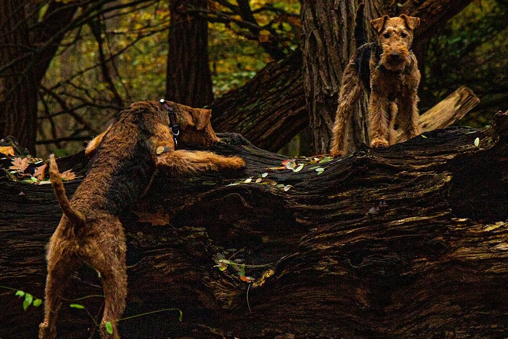 I met the dogs in the forest. The largest dog was obviously thirsty because she started to gulp down the water that was lying in a hole in the old tree trunk.