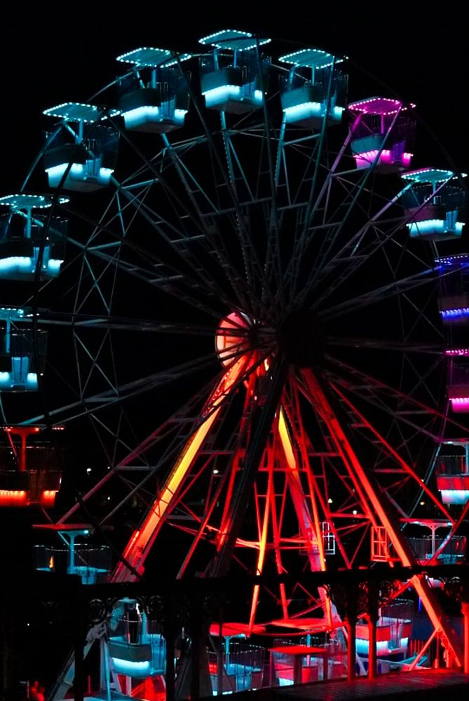 A deserted fairground where the colours of the Ferris wheel stand out tremendously. Photographed on a fairground boulevard during the dark night in England.