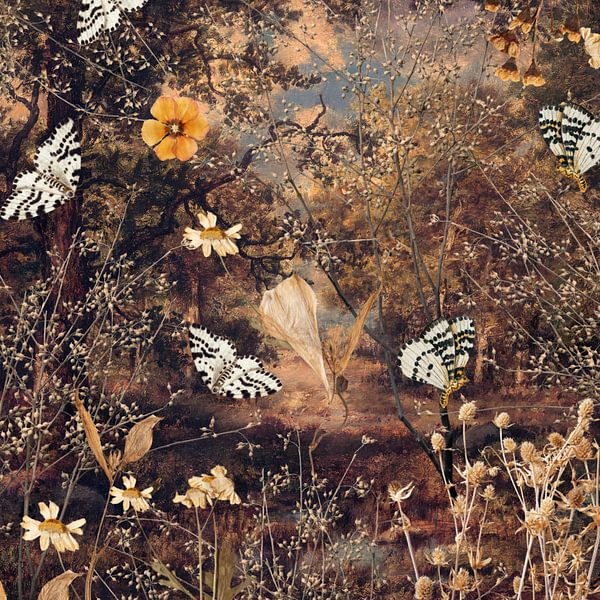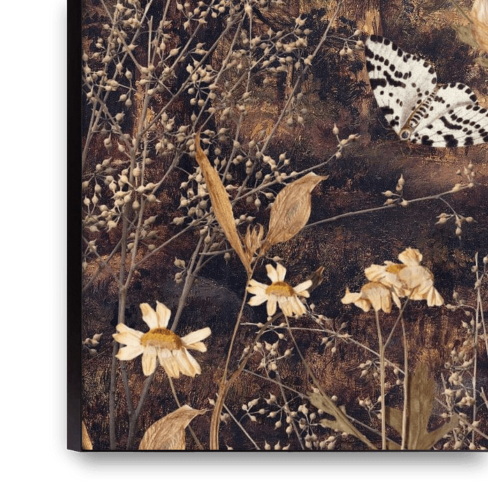 This artistic work of art combines the refined beauty of a vintage herbarium with a dreamy, surreal atmosphere. The result is a unique piece of wall decoration that feels both nostalgic and modern.