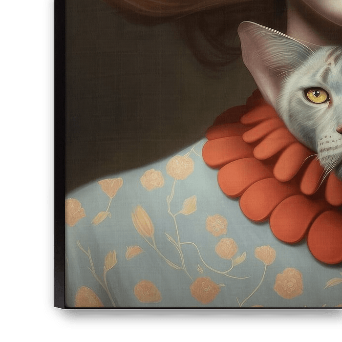 Digital art work titled: "This is us: my cat and me". Portrait of a red-haired/blonde girl wearing classic clothes in pastel colours with a grey cat with yellow eyes in her collar. Contemporary art, living style contemporary and design. This work looks best in large format on artframe, acrylic glass or dibond. This work makes a real statement in your home, office, restaurant, wellness, practice or organisation.