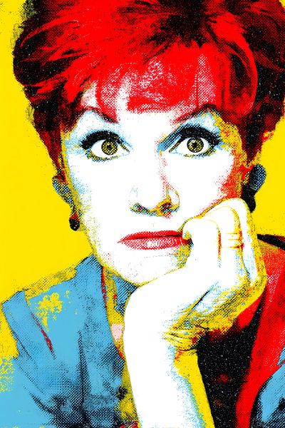 A Pop Art portrait depicts a woman with bright red hair against a garish yellow background. Her gaze is direct, almost piercing, her eyes wide open. Her head rests on her hand, an expression that oscillates between thoughtfulness and bored nonchalance. The coarse grid pattern and bold primary colours lend the image a striking, almost…