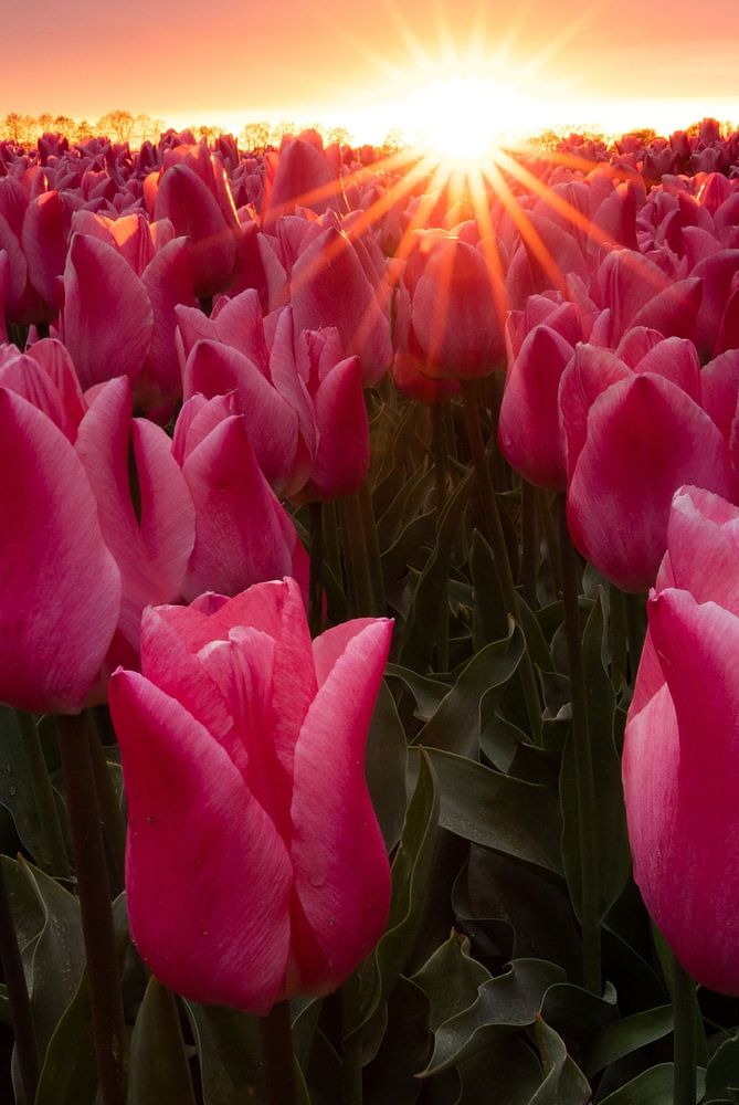 A photo in portrait mode of pink tulips during the setting sun. I photographed the sun as a star. The sky is heavy and colored purple and orange by sahara sand and pollen. Because of the point of view of the tulips and a focus stack (combining multiple images) you get a nice 3d effect. The photo was taken during spring, at one of the tulip fields in Drenthe. The photo was taken on April 25, 2022 at the Brunstingerveld near Beilen, Drenthe (Netherlands).
