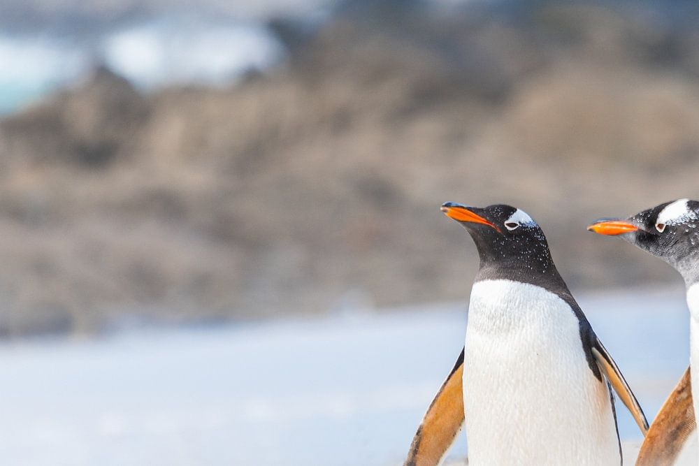 On the quiet beaches of Carcass Island in the Falkland Islands, three gentoo penguins appear to be engaged in a lively discussion. With their bright orange beaks and striking white breast, they stand out sharply against the soft, faded foreground and rugged coastline in the background. This peaceful moment captures the natural beauty and charm of these social seabirds in their remote habitat.