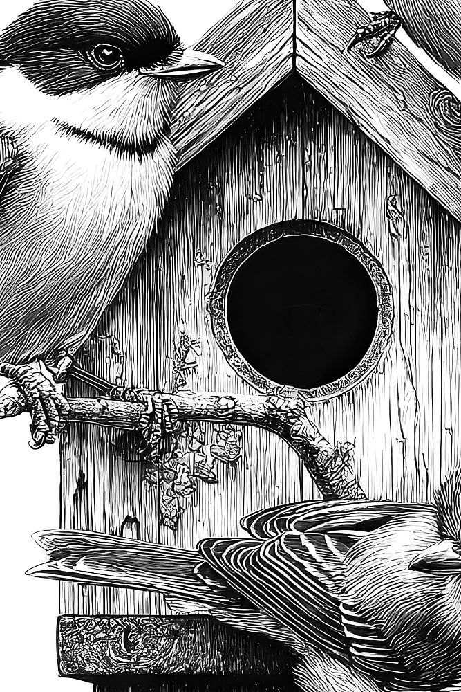 A quiet woodland moment, captured in crisp black-and-white detail: three small songbirds gather around a weathered birdhouse, each perched in its own natural pose. Fine, hand-drawn linework brings out every feather edge, soft downy chest, and subtle shadow, while the birdhouse’s aged wood grain, knots, and worn texture add a comforting…