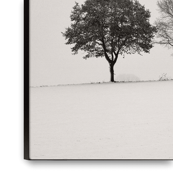 Photograph of a wintry landscape with trees in minimalist style in black and white.